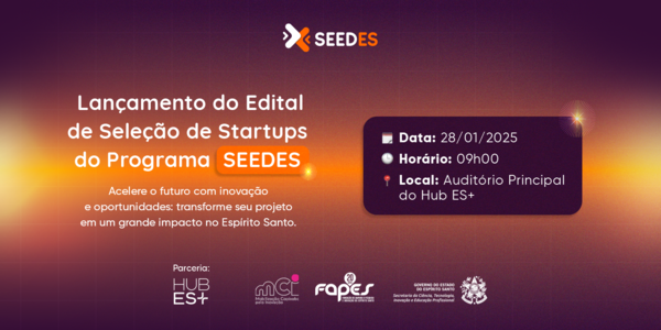 O Governo do Espírito Santo realiza, no dia 28 de janeiro de 2025, às 9h, o evento de lançamento do edital de seleção de startups para o Programa Seedes, no Hub ES+, localizado em Vitória. A iniciativa visa impulsionar o ecossistema de inovação capixaba, fomentar o empreendedorismo e acelerar startups com alto potencial de impacto socioeconômico.