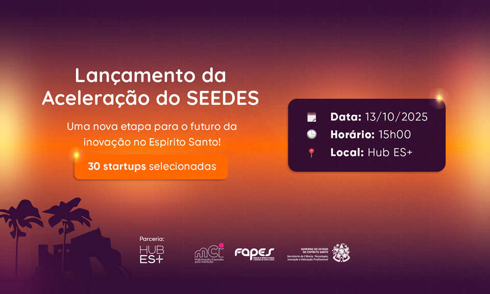 O Programa Seedes, primeiro programa público de aceleração de Startups do Espírito Santo, realizará, no dia 13 de outubro, às 15h, no Hub ES+ (Vitória), o evento oficial de lançamento da Aceleração. A ocasião será um marco para o ecossistema de inovação do Estado, celebrando o início de uma nova fase para 30 negócios inovadores.